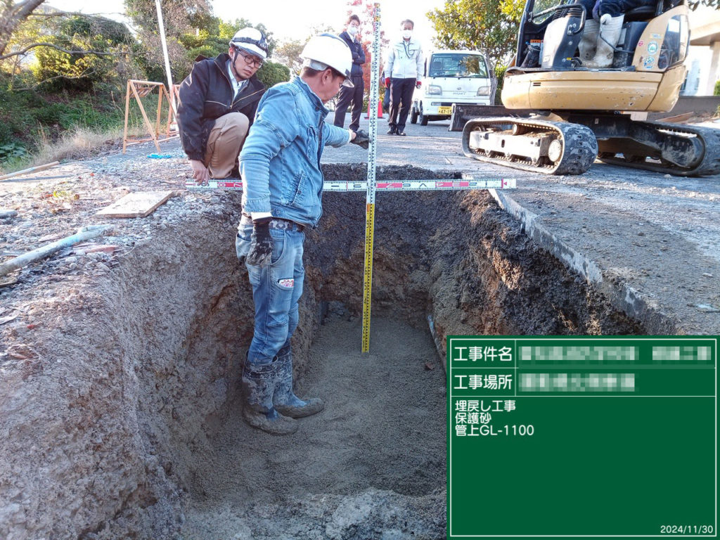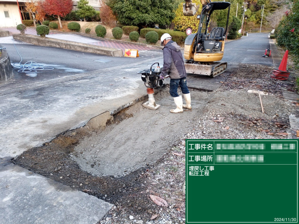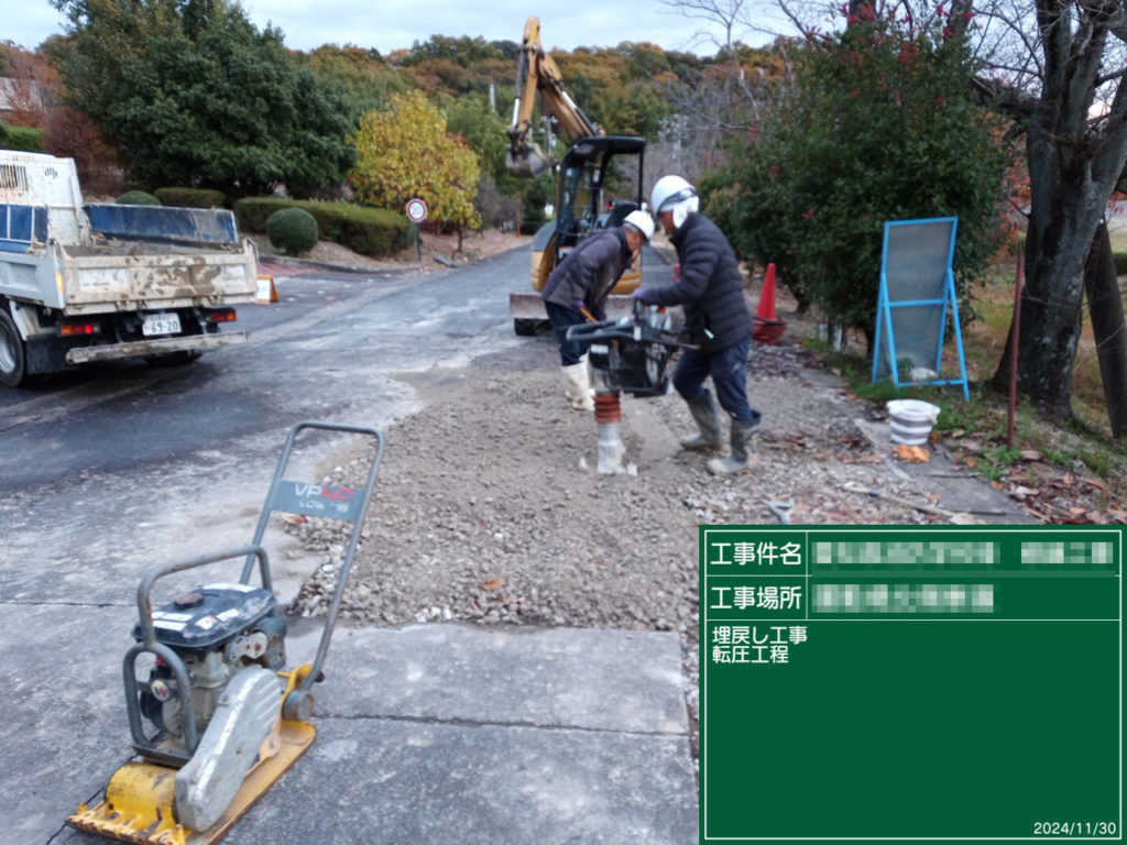 保護砂で配管を覆った後、掘削した穴を元の状態に戻すために土や砕石などで埋め戻します。この際、地盤沈下を防ぐために層ごとに転圧機を使用して締め固めます。適切な転圧により、将来的な地盤沈下や舗装の破損を防止します。
